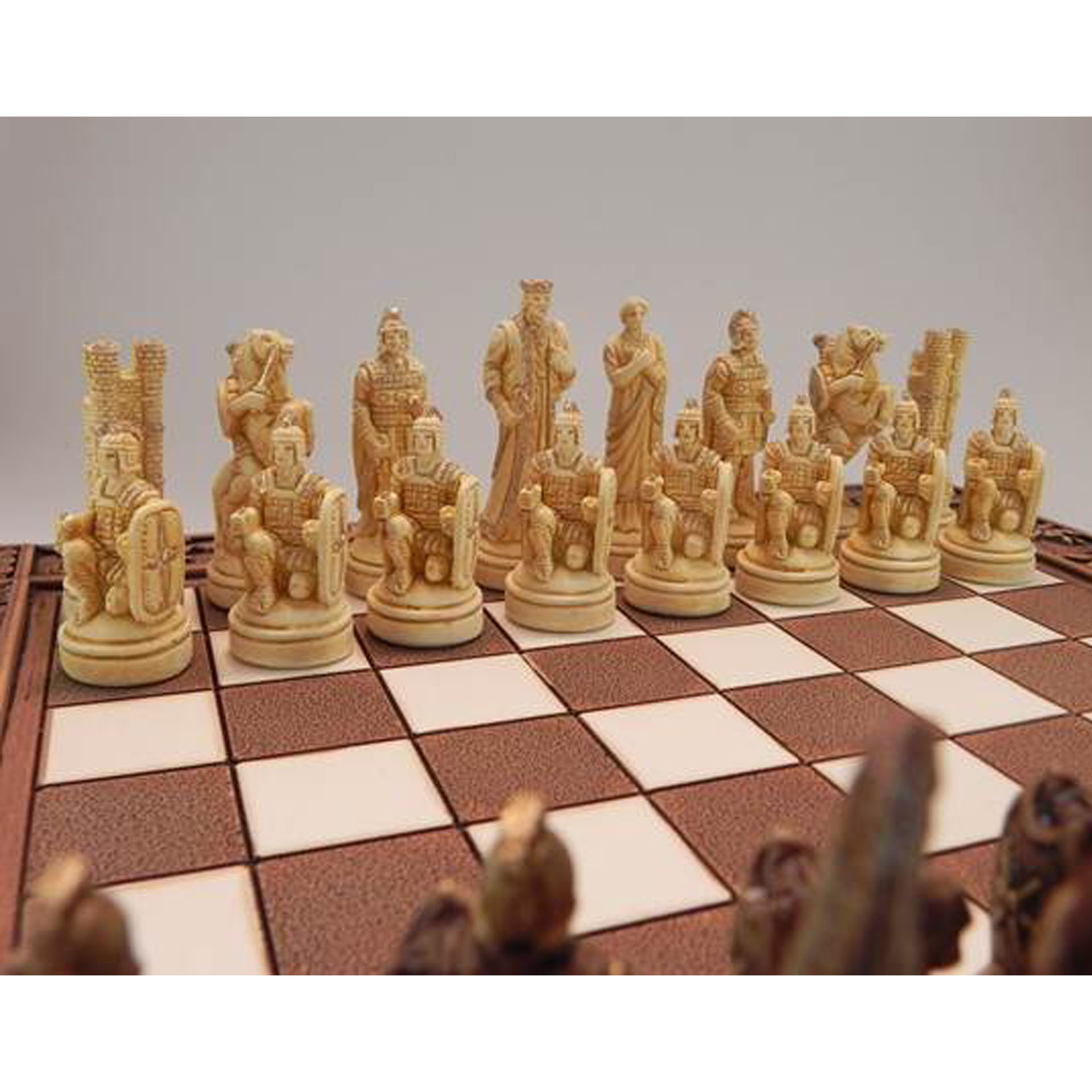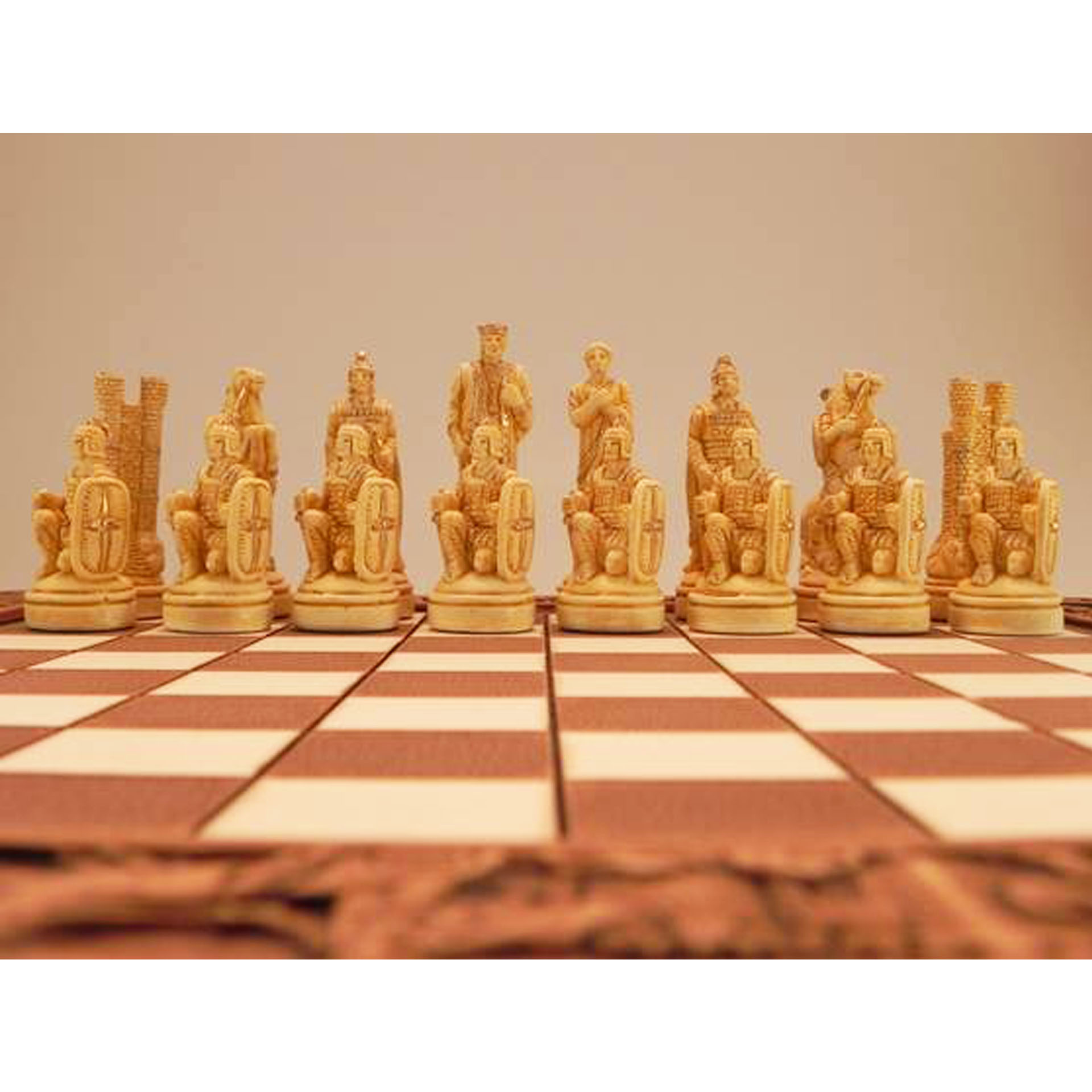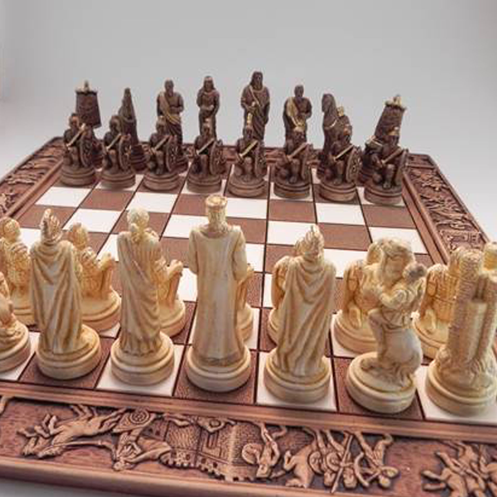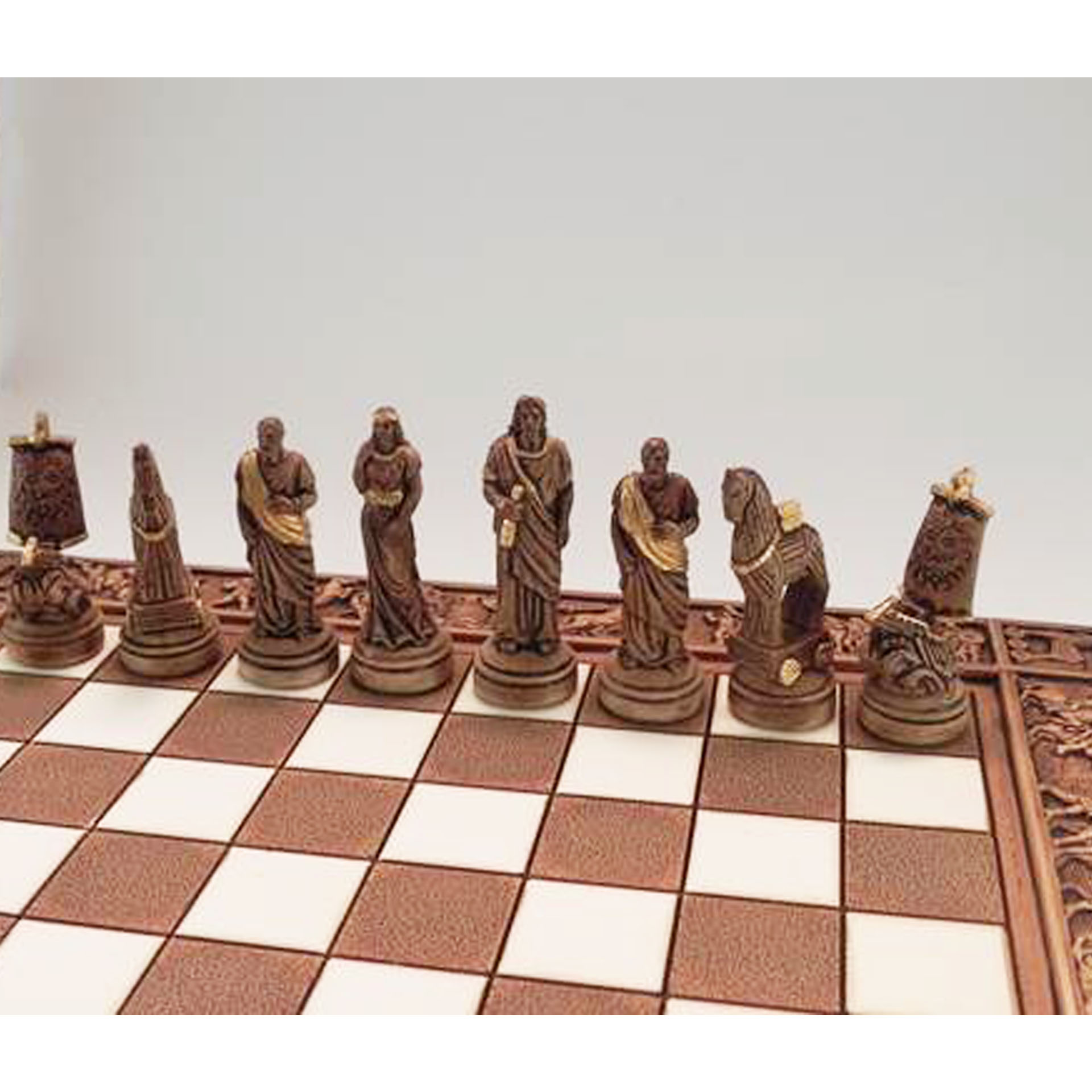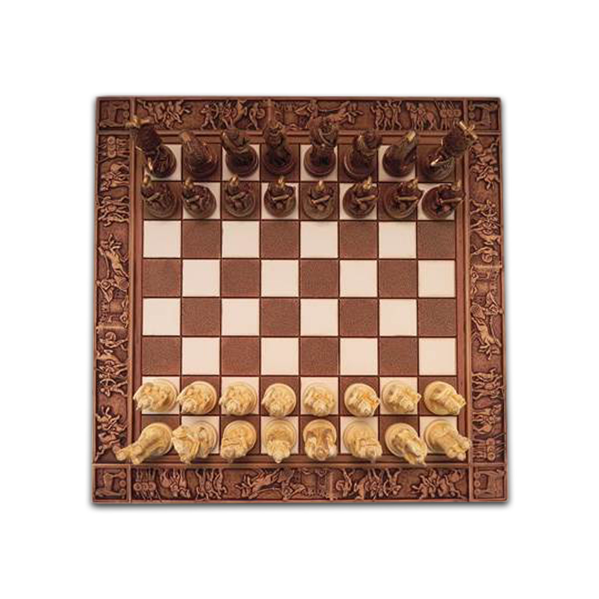 Ceramic hand-made chess pieces inspired from Greek antiquity and represent the trojan war and especially the war of Greeks against the Trojans during the 11th-century b.c. in gold color. The dimensions of the chessboard are 30*30cm.