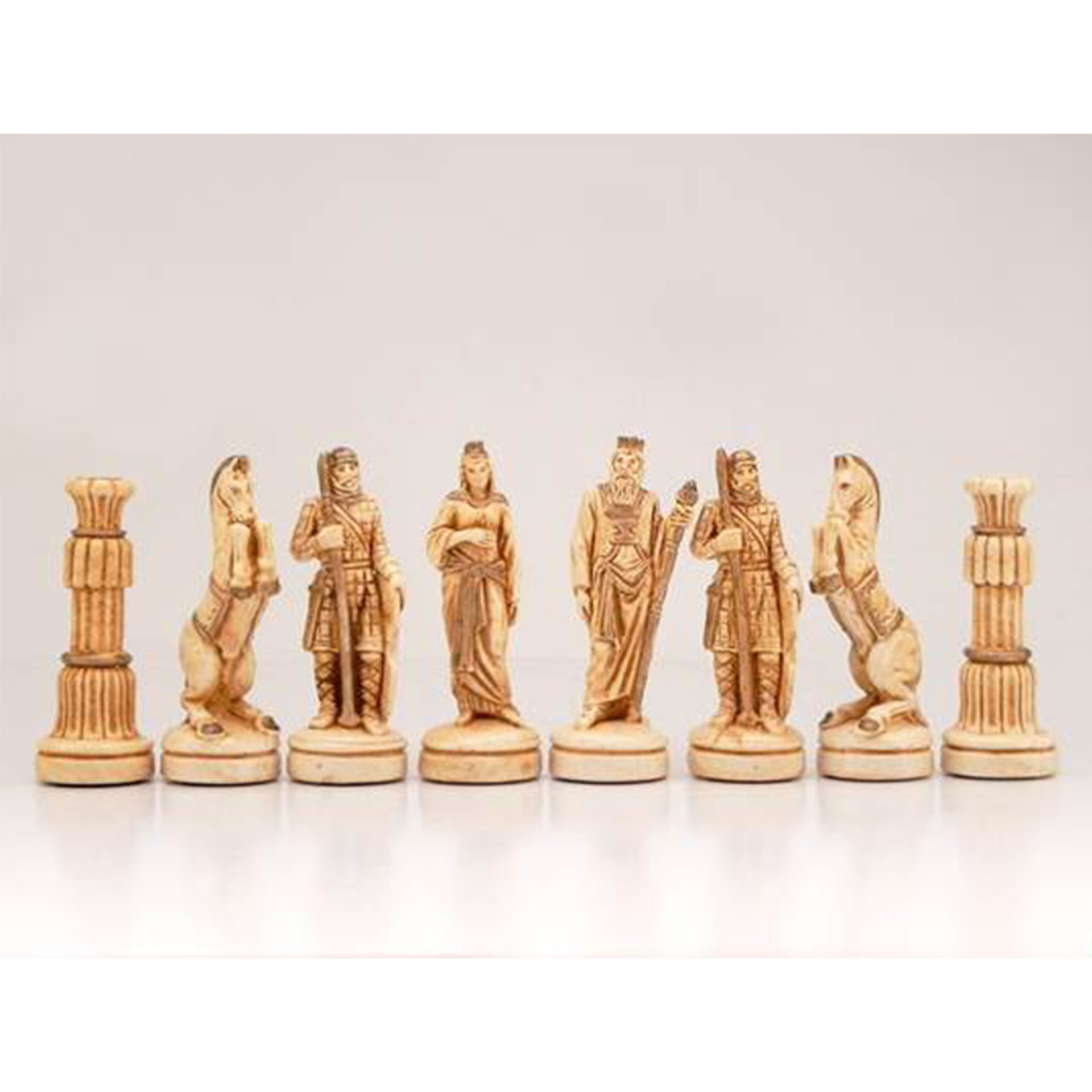 Ceramic hand-made chess pieces inspired from Greek antiquity and represent the Greek Persian war and especially the battle of Thermopiles during 480 b.c.. in gold color. The leader of the Greek army was the king of Spartans Leonidas and the leader of the Persian army was King Xerxes The dimensions of the chessboard are 30*30cm.