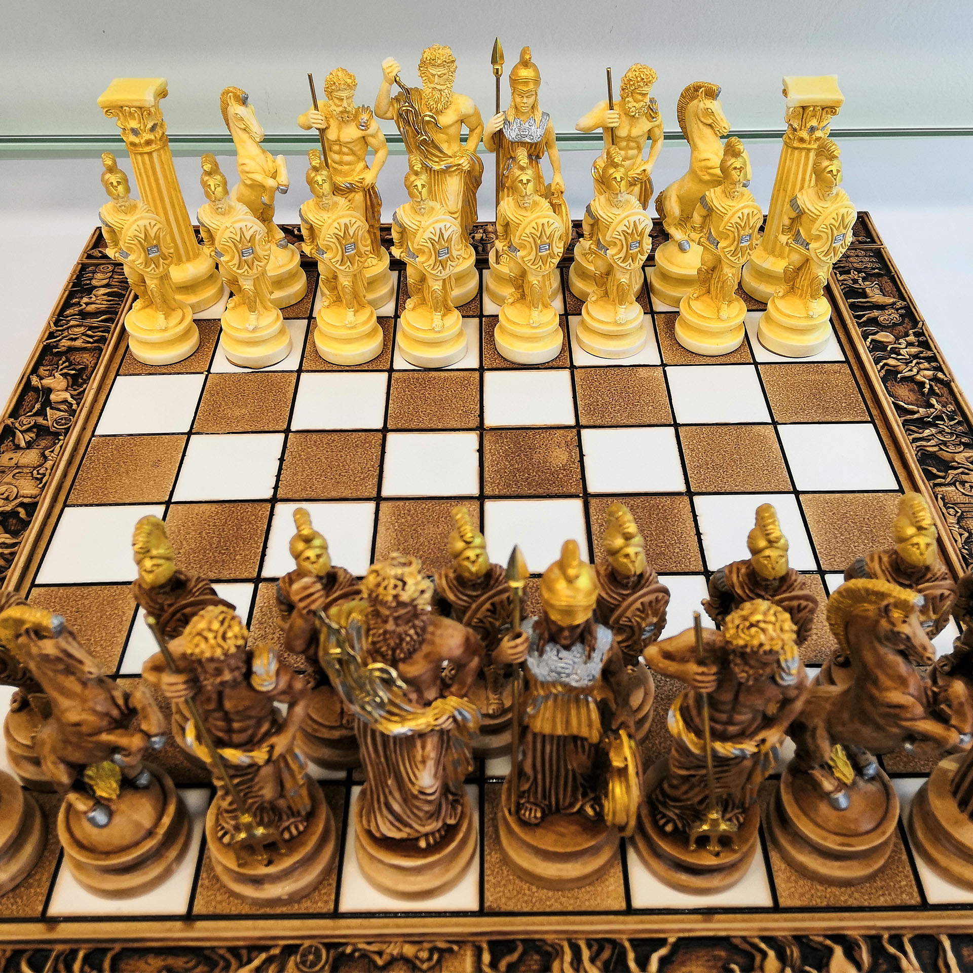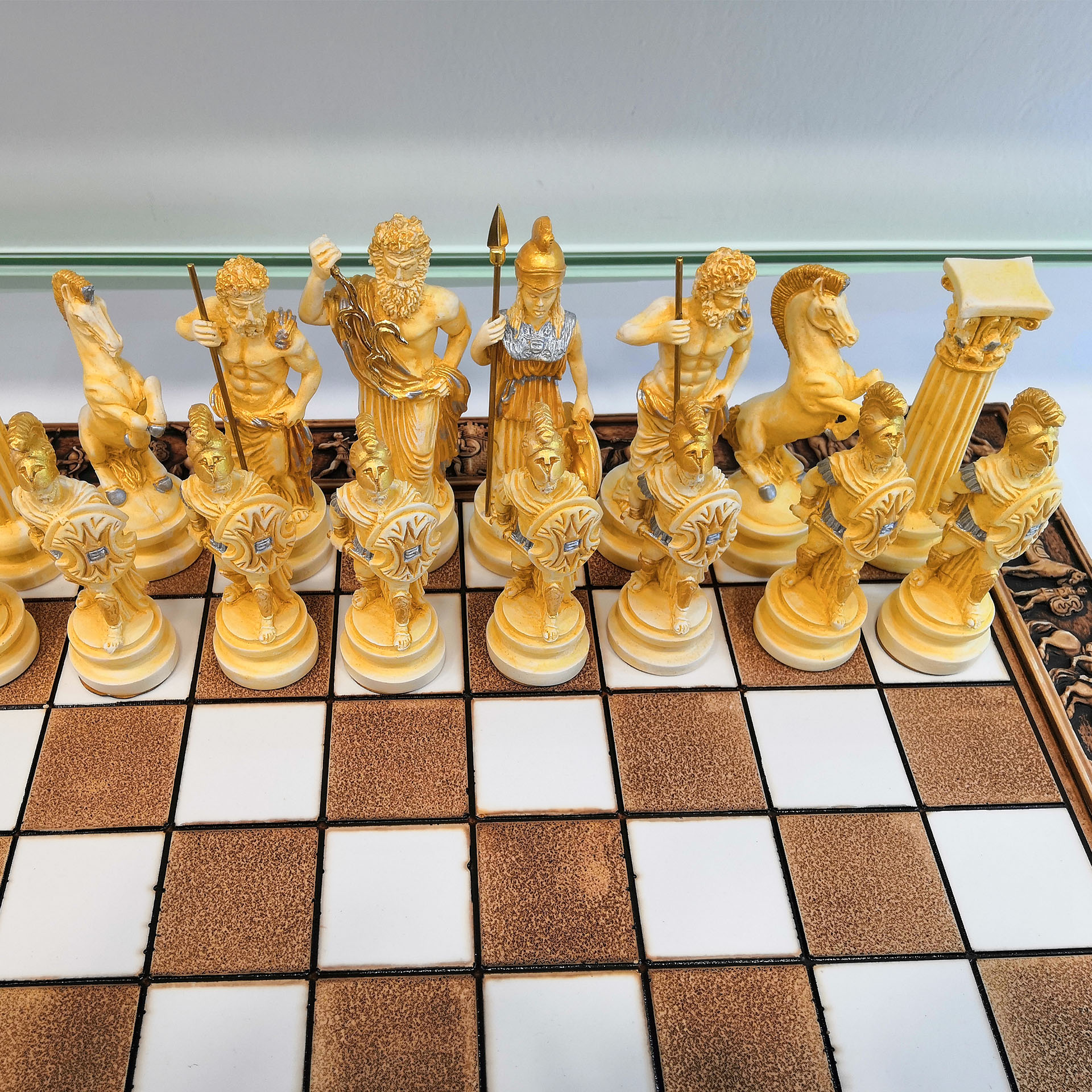 Οι πιο σημαντικοί θεοί της αρχαίας Ελληνικής Μυθολογίας (Δίας, Αθηνά, Ποσειδώνας) αποτελούν τις κεντρικές μορφές σε αυτό το υπέροχο σκάκι πλαισιωμένοι από τις κολώνες του Παρθενώνα και τους Σπαρτιάτες μαχητές.