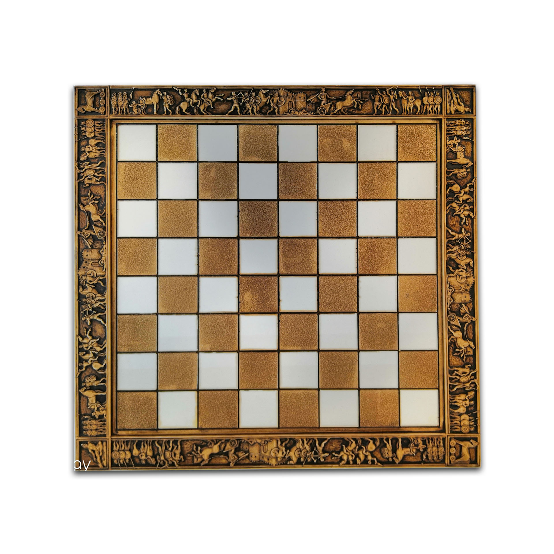 ΣΕΤ ΣΚΑΚΙ ΕΛΛΗΝΙΚΗ ΜΥΘΟΛΟΓΙΑ με χρυσά πιόνια και με ανάγλυφη κεραμική σκακιέρα 45χ45cm