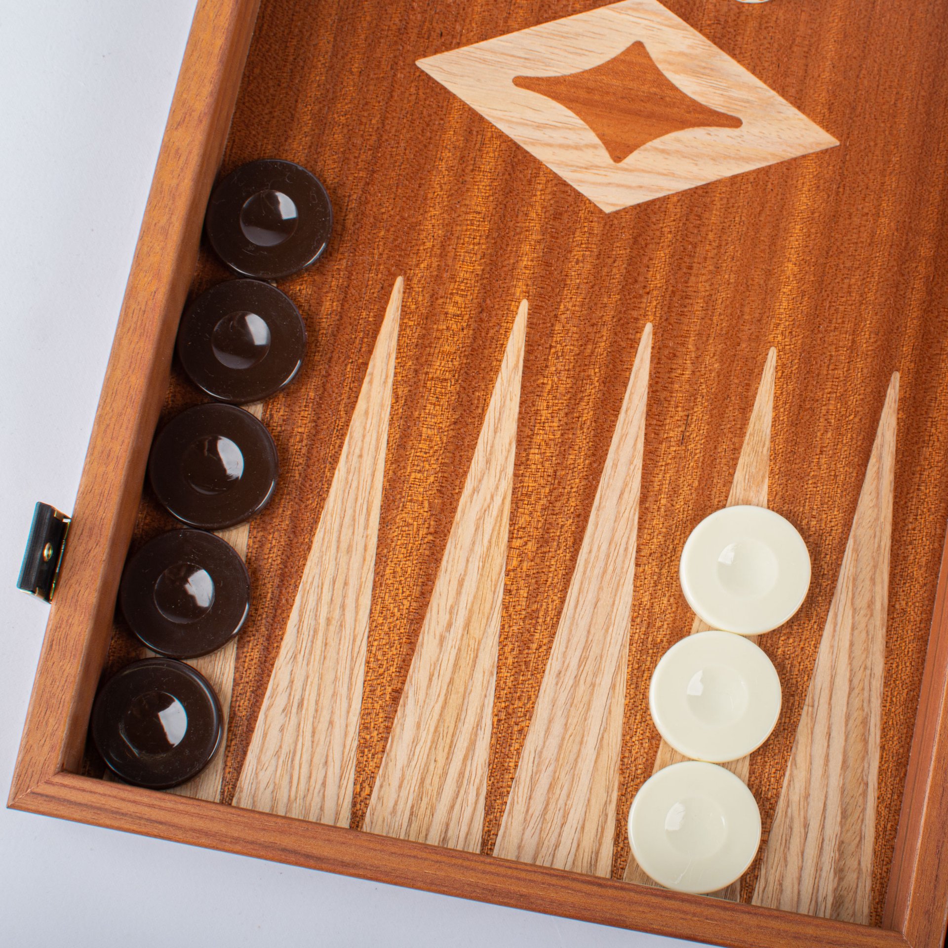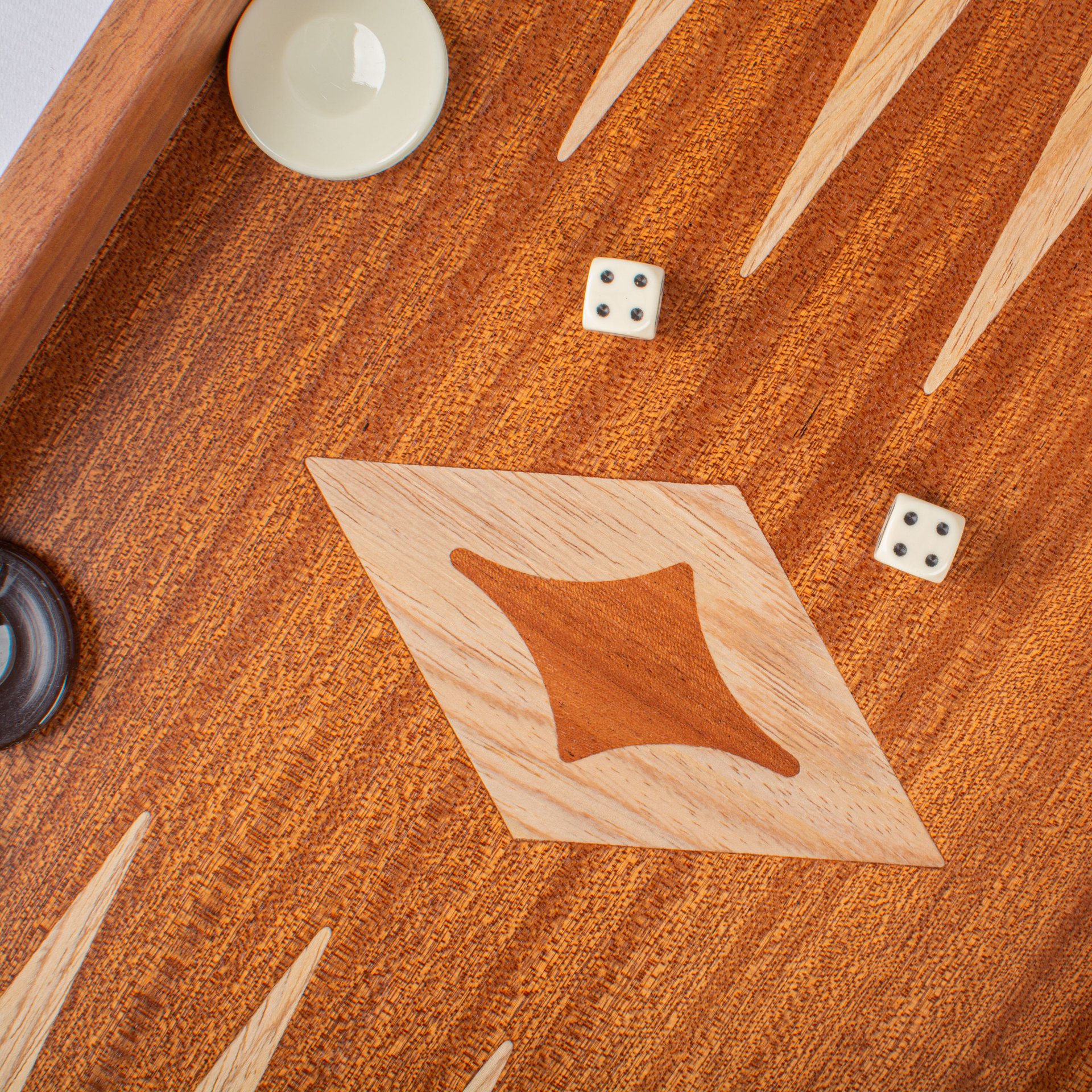Το μαονένιο λούστρο είναι μοναδικό και γι’ αυτό το λόγο κάθε τάβλι είναι διαφορετικό από το άλλο. Αυτό το τάβλι είναι κατασκευασμένο με την τεχνική της ένθεσης ξύλου (μαρκετερί) .